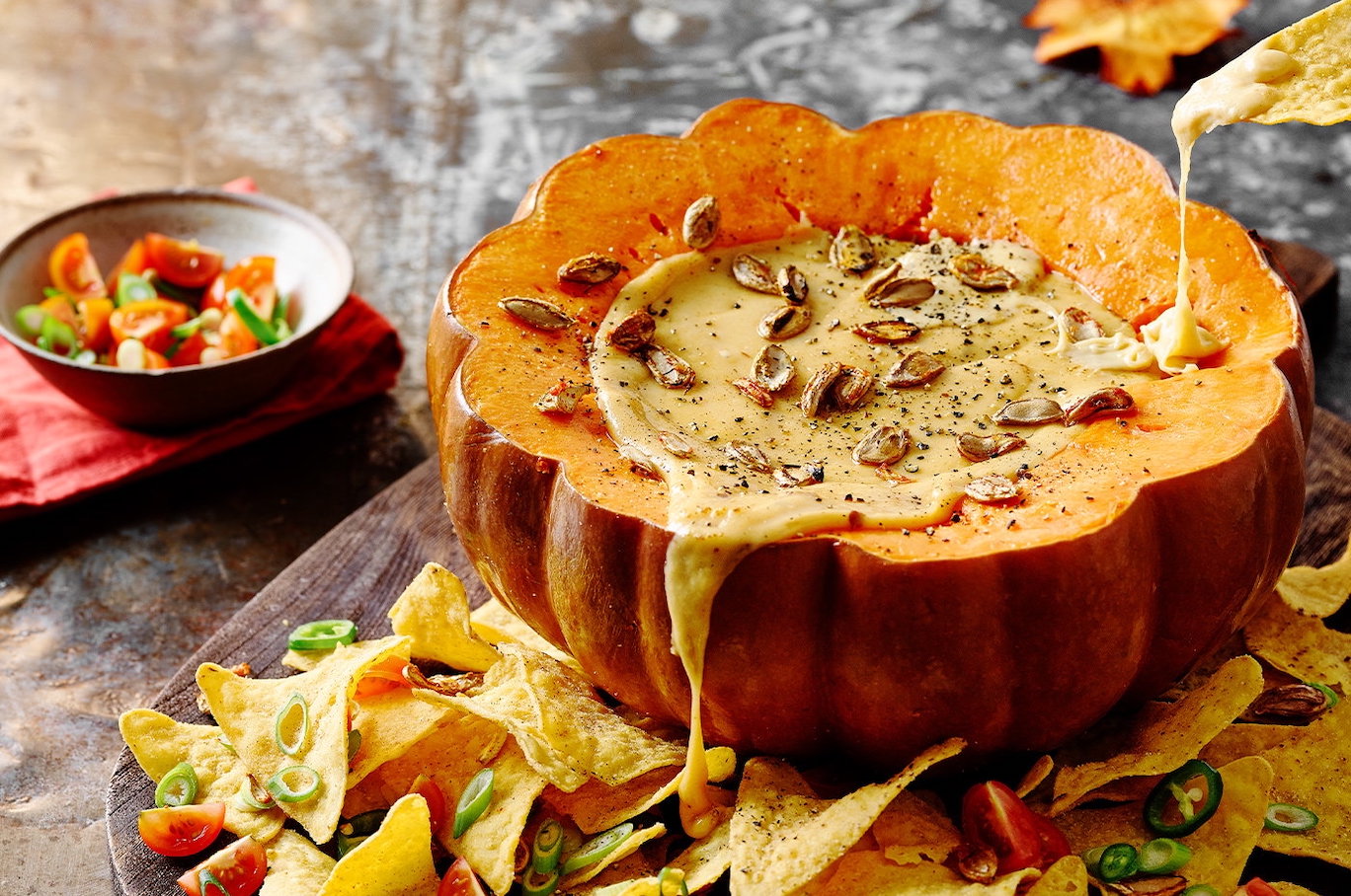 NACHOS PUMPKIN FONDUE A delicious blend of Cheddar, Emmental and White Wine makes this a melty delight for your Halloween…