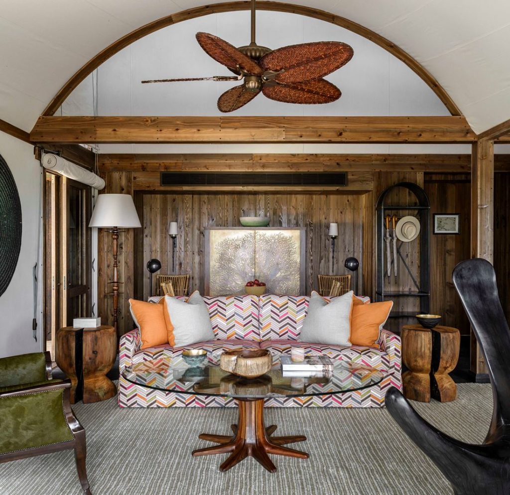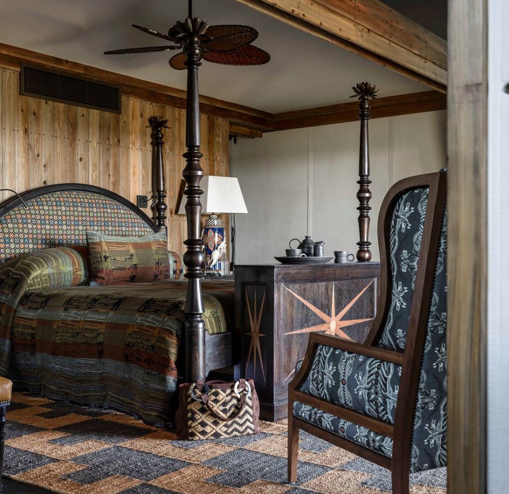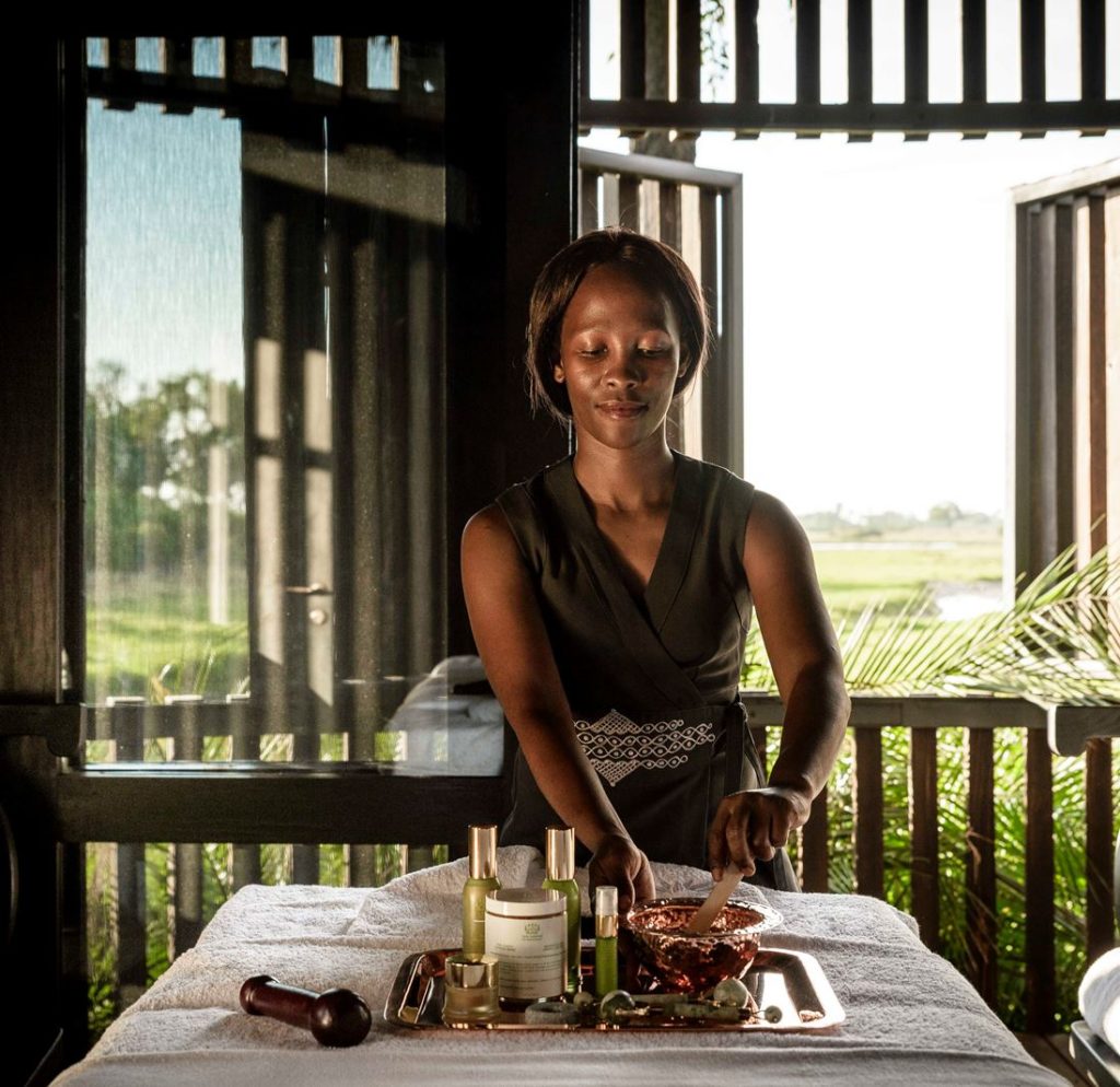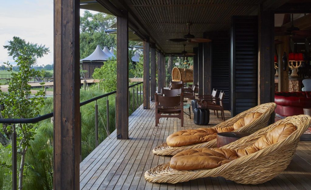 The 12 suites, most facing over the floodplains, are linked to the main areas by elevated boardwalks winding between the trees. Each is a self-contained oasis of indoor-outdoor living spaces filled with contemporary furniture and art, commissioned and sourced through Cape Townโs Southern Guild gallery. Bedrooms are lavishly layered โ plump cushions, ornate Ardmore bedside lamps, rich, textured fabrics โ itโs hard to believe youโre in the wilderness