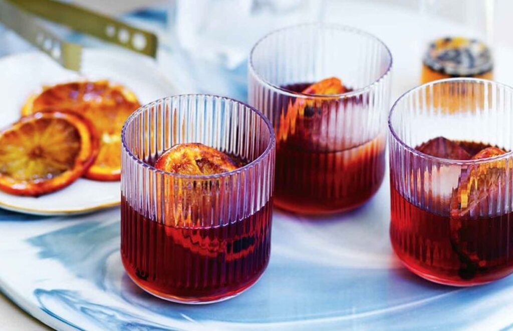 Fill serving glasses with ice cubes. Combine gin, vermouth and Campari in a large jug. Divide among glasses, top with warm syrup and caramelised orange, and serve immediately.