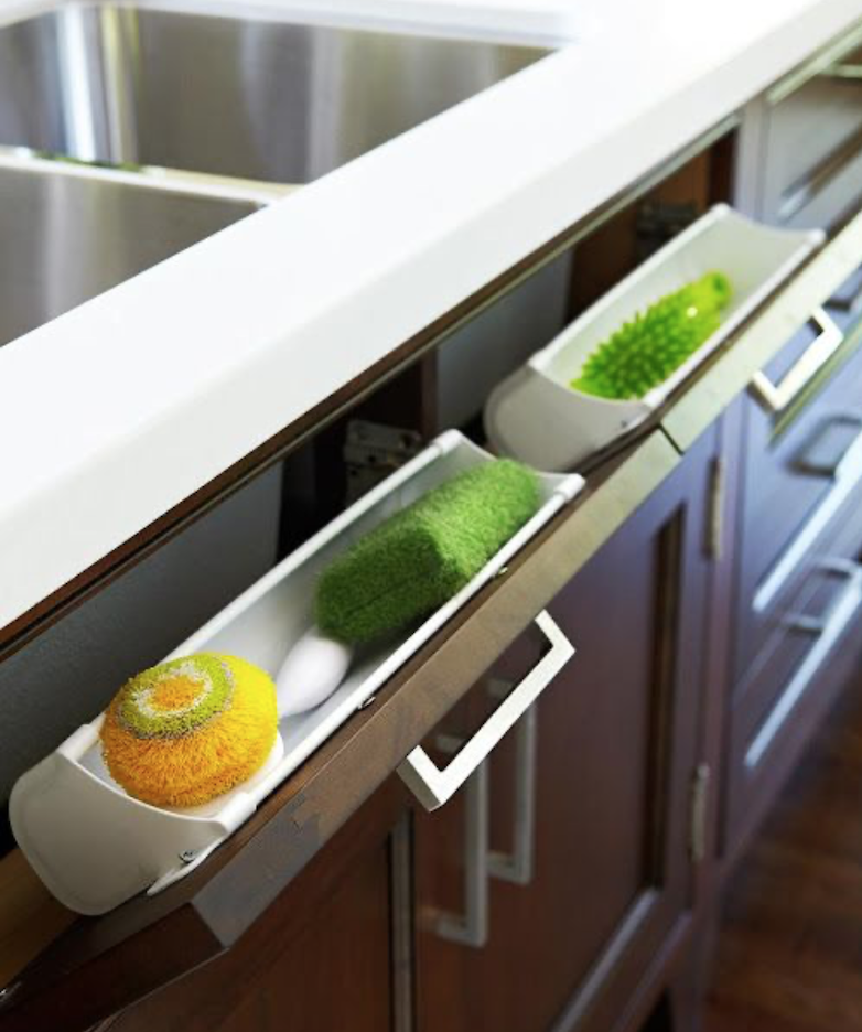 Instead of putting your dirty sponges on display for the whole world to see, you can tuck them away in this sneaky compartment. The pull-down panel is equipped with plastic tubs that are ideal for stashing cleaning supplies like sponges, scrub brushes, and more, and it will help keep your counters clutter-free.