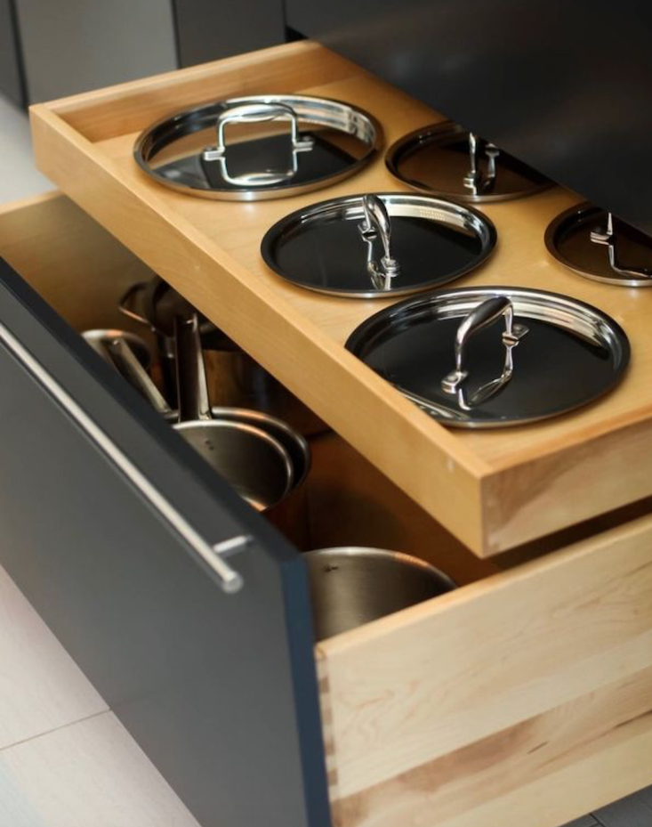 We know that you are not supposed to stack your pots and pans, but most people do. However, the one issue is that there’s no good way to store their lids. Enter, the lid drawer. This ingenious shallow drawer is the perfect spot to stash all sorts of pot and pan lids for easy access.
