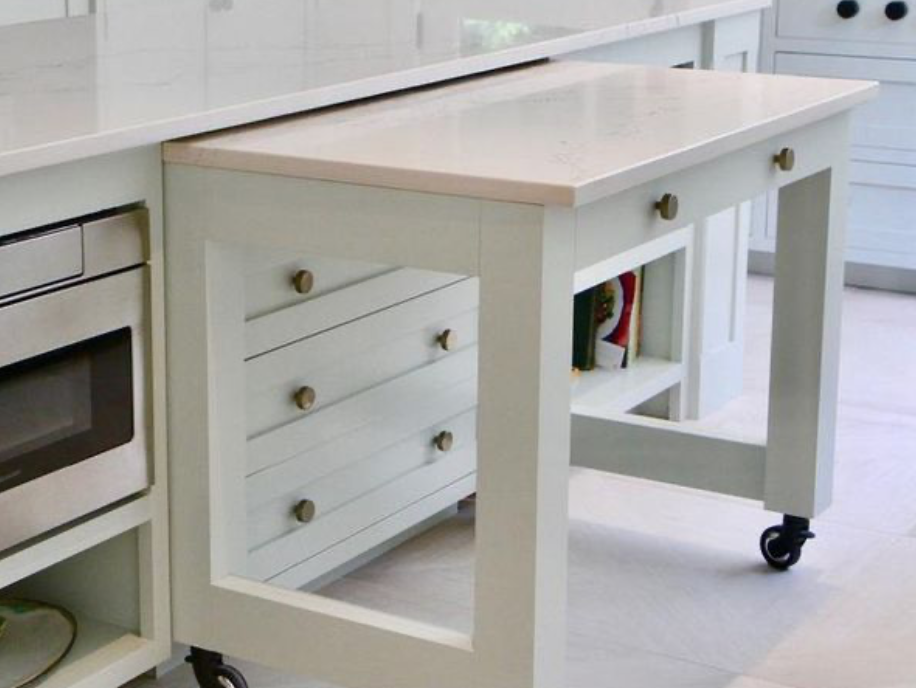 It looks like merely another drawer, but it’s really a pull-out island extension. Simply genius! This extendable counter is mounted on wheels, allowing you to drag out when you need more counter space.