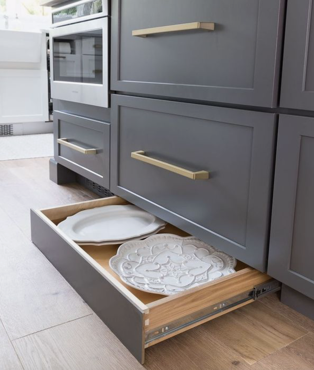 These drawers are hidden in a typically wasted space: The baseboard under your kitchen counters, and their slim design is ideal for storing baking sheets, platters, and other thin items. Plus, the best part is that they’re push-activated, so you can open them with your feet!