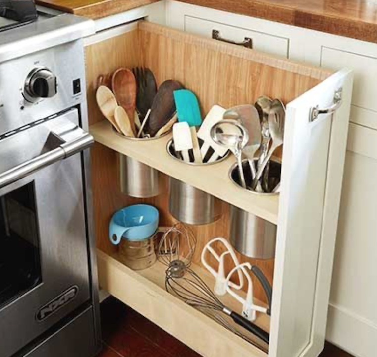 This cool slide-out cabinet takes the place of that skinny cabinet beside the oven and features several containers to hold cooking spoons, spatulas, whisks, and other awkward cooking implements that don’t lend themselves to flat storage.