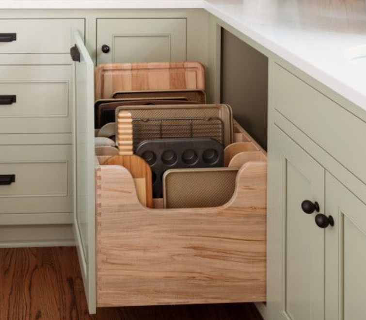 If you have an impressive collection of baking gear, this custom drawer is the perfect place to store pans, trays, and racks of all shapes and sizes. It takes up the whole depth of the counter, so you can even fit large cutting boards and baking sheets into its built-in slots. Just like that, you’ll never have to struggle with unwieldy stacks of baking trays to find the one you need.