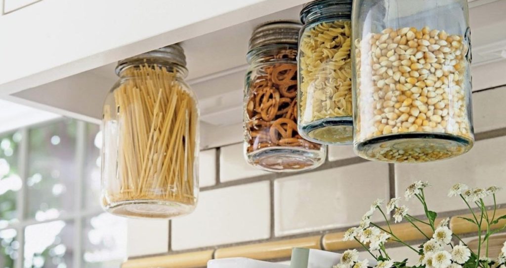 It couldn’t be simpler and you will wonder why you never thought of this before. Affix your jar lids under your cupboards and voila! More kitchen counter space