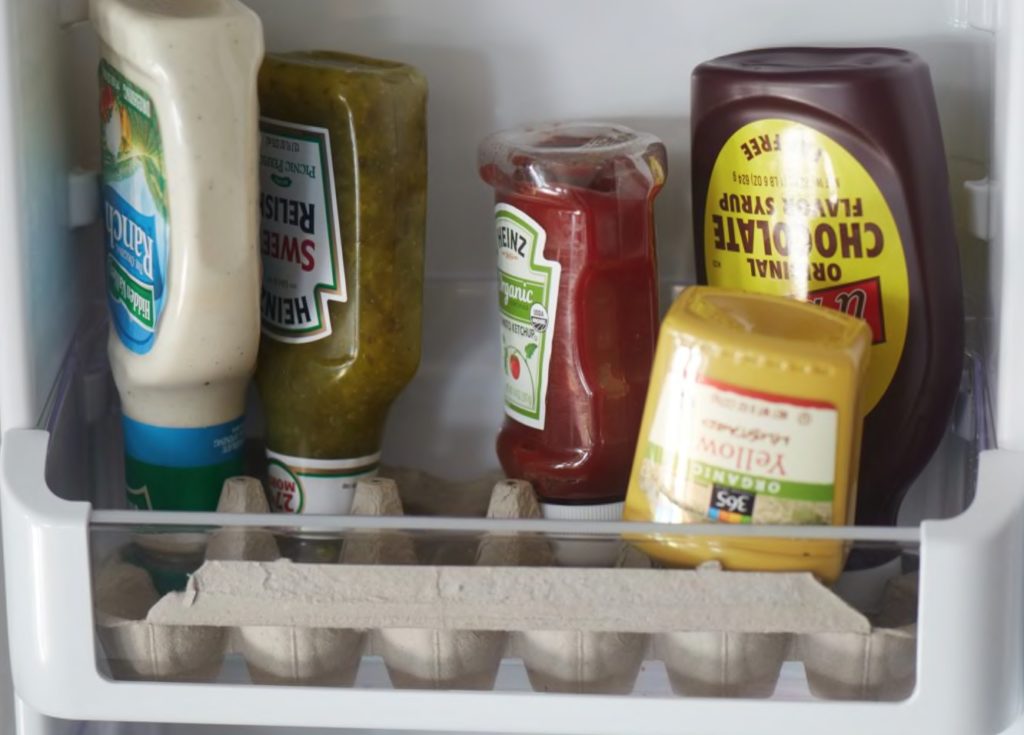 When you’re done with a carton, separate the top and bottom and use one to line the bottom of the shelf on your fridge’s door, then store condiments mouth-side down.