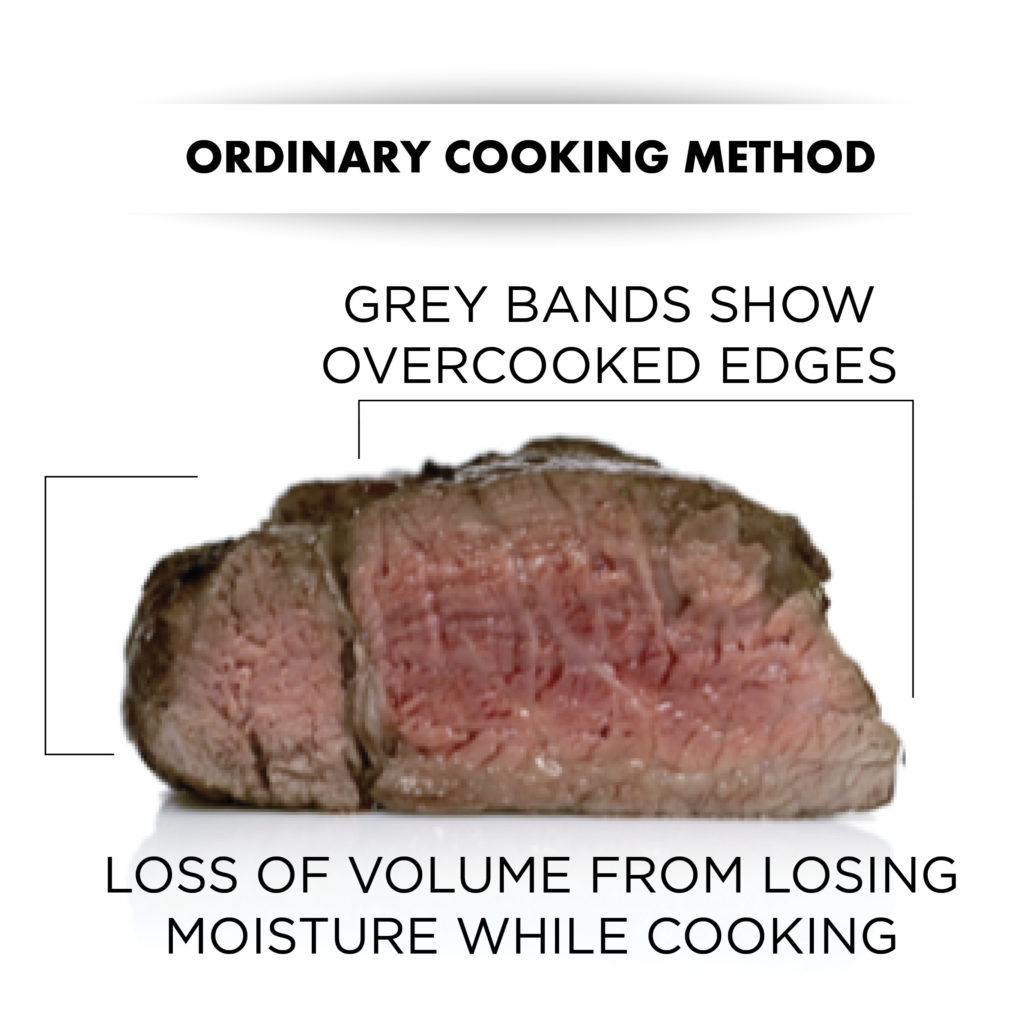 The same can be said of the sous vide steak on the left. You can easily see how beautifully itโs been cooked from edge to edge, whereas the pan-cooked steak has overcooked edges. Another significant difference to note is that the volume and mass of the pan-cooked steak are severely diminished because of a loss of moisture.