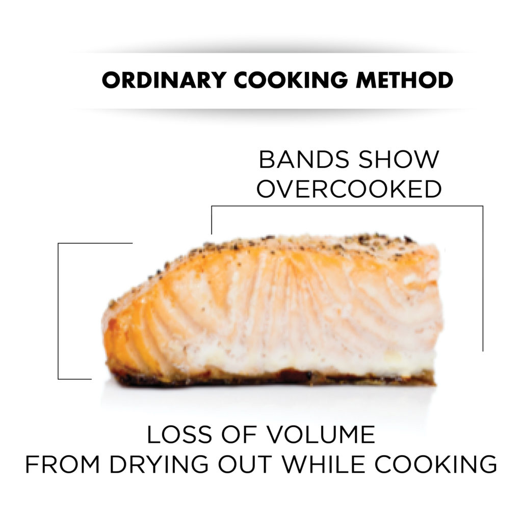 As you can see from the sous vide salmon on the left itโs perfectly cooked from edge to edge. It also retains a beautiful translucent pink colour and a delicate, flaky texture. The traditional pan-cooked salmon on the right suffers from being overcooked due to the pan temperature being higher than the target temperature, resulting in a dry product.