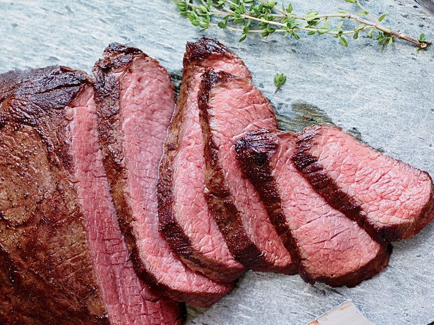 Finish off the steak by searing either side in a skillet with the canola oil for 30 to 40 seconds, using the butter as a basting throughout.