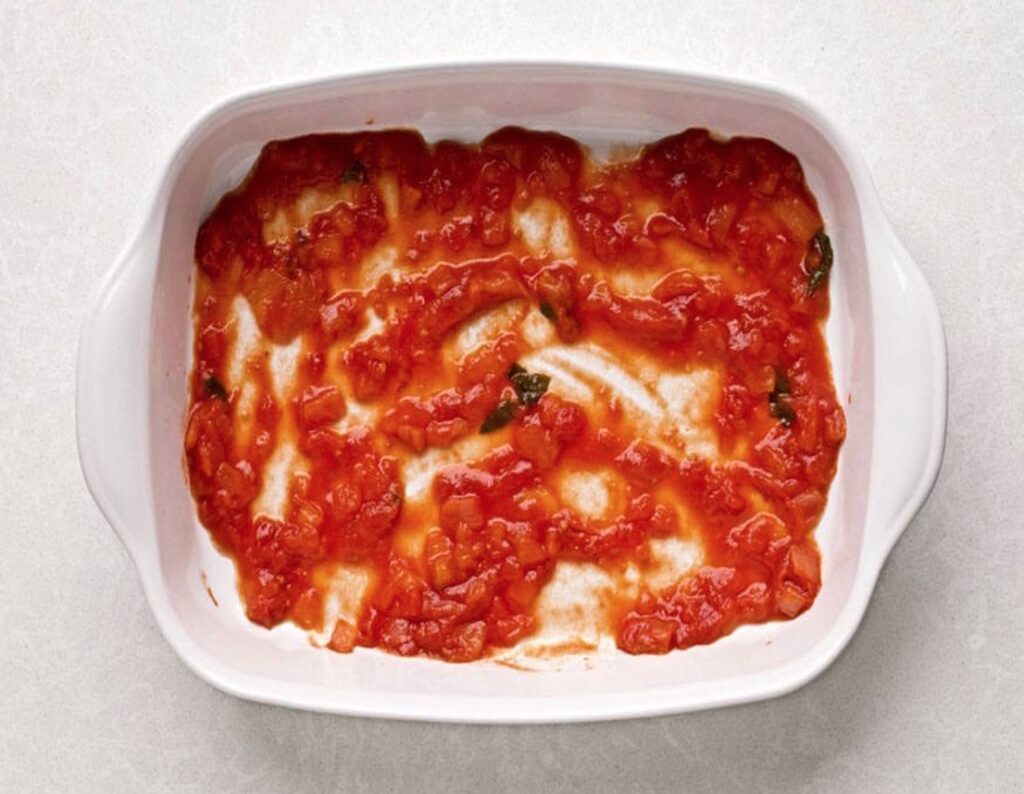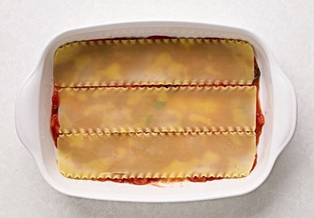 Spread a thin layer of red pasta sauce in the bottom of a lasagne baking dish. The add a layer of cooked or no-boil lasagne noodles. It’s okay if you have to cut the sheets to fit the pan.