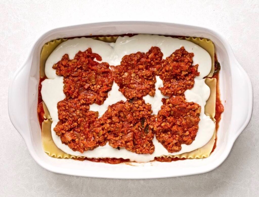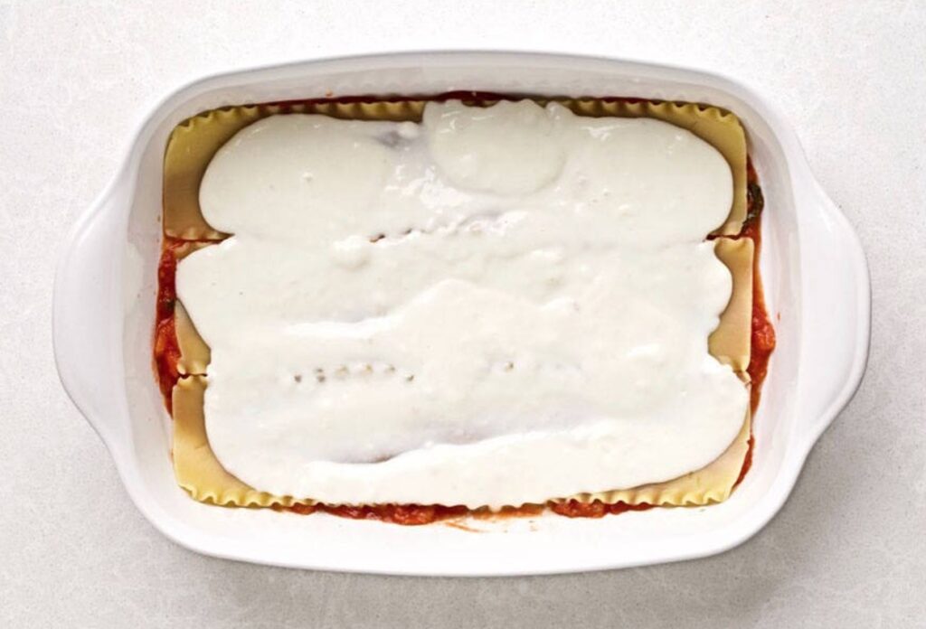 Spread an even layer, about ⅓ of the white sauce or ricotta mixture with the back of a spoon. Then spread an even layer, about ⅓ of the red sauce.