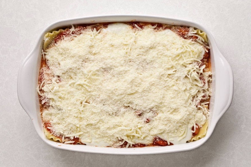 Top the lasagne with a final layer of noodles, white sauce/ricotta and red sauce, mozzarella, and Parmigiano Reggiano cheese.