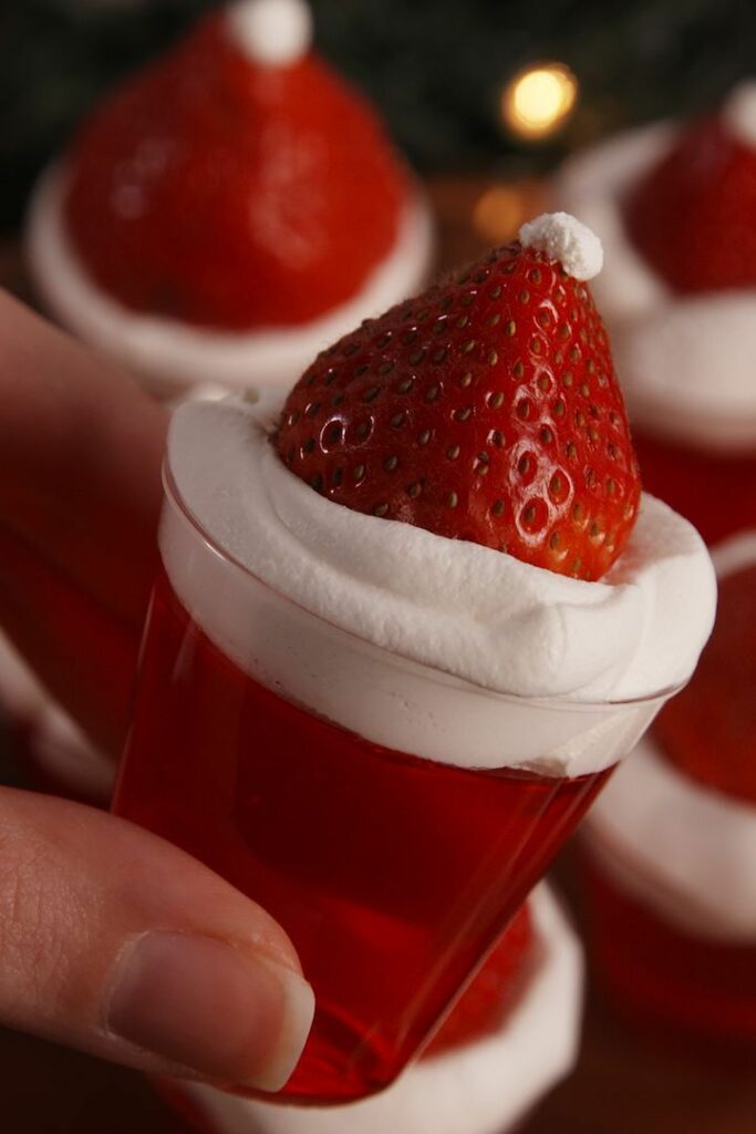 A Christmas party wouldn’t be complete without Father Christmas and these jell-o shots are the perfect way to include him. Strawberries and Cool Whip turn a simple jell o-shot int into a festive holiday one!