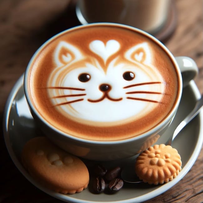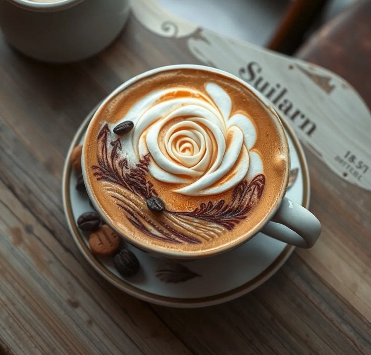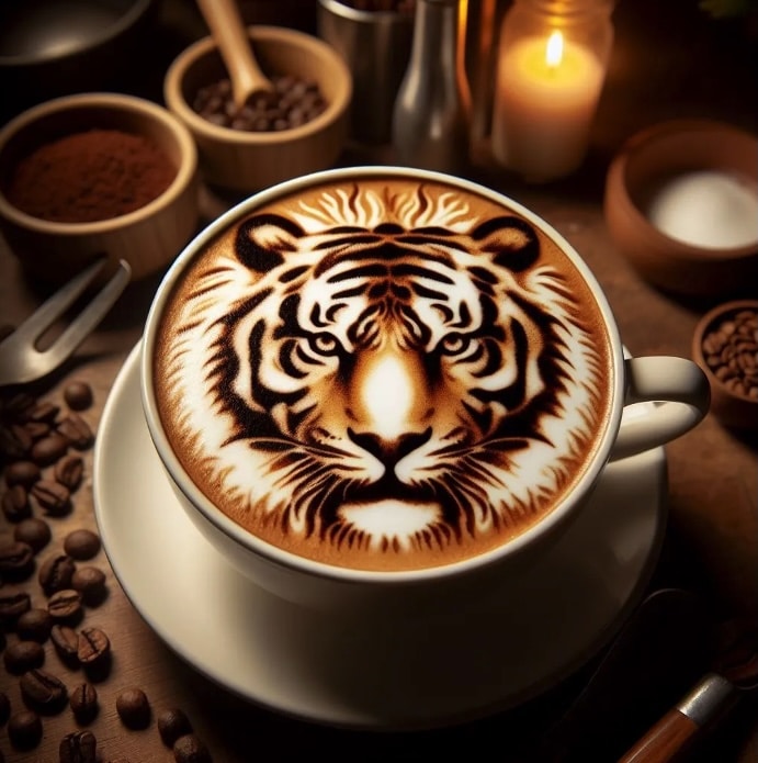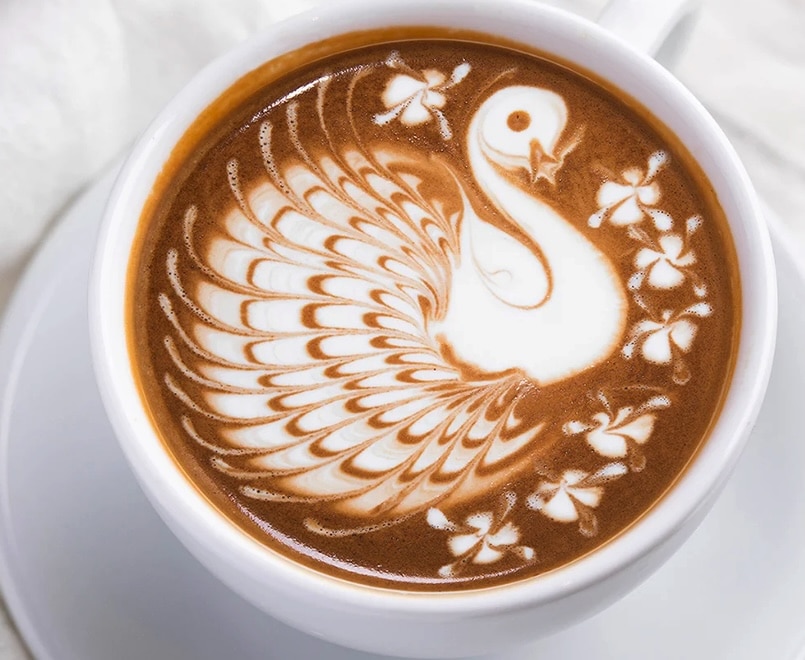 Latte art’s style features intricate and detailed designs that are both expressive and whimsical. The art showcases fine lines and fluid forms, often depicting characters, animals, and mythical creatures. The colour palette is dominated by warm browns and creamy whites, creating a natural and inviting look. The compositions are centrally focused with symmetrical balance, highlighting the decorative and ornamental nature of the style. This approach emphasizes the playful and imaginative aspects of latte art, capturing the essence of cafe culture and barista craftsmanship.