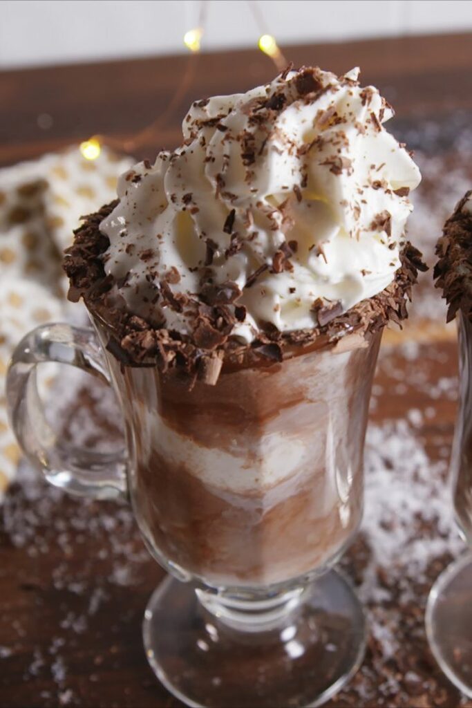 - Step 1: Pour melted chocolate and chocolate shavings into separate shallow dishes. Dip rims of two mugs in melted chocolate then immediately dip in chocolate shavings.