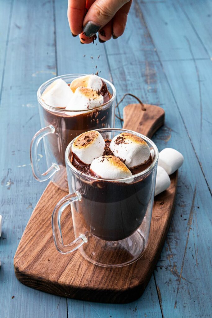 - Ladle cocoa into mugs and top with toasted marshmallows and chocolate shavings.