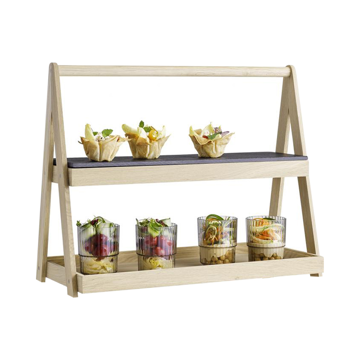 The 2-tier wooden display tray from APS Germany is designed for presenting and serving food items in an aesthetically pleasing and organized manner. The tray is made of wood, which adds a natural and rustic touch to the presentation. Wood is also a durable material suitable for food service environments. The tray is designed with two tiers, allowing for multi-level presentation of food items. Each tier of varying sizes, providing flexibility in arranging different types of food or products.