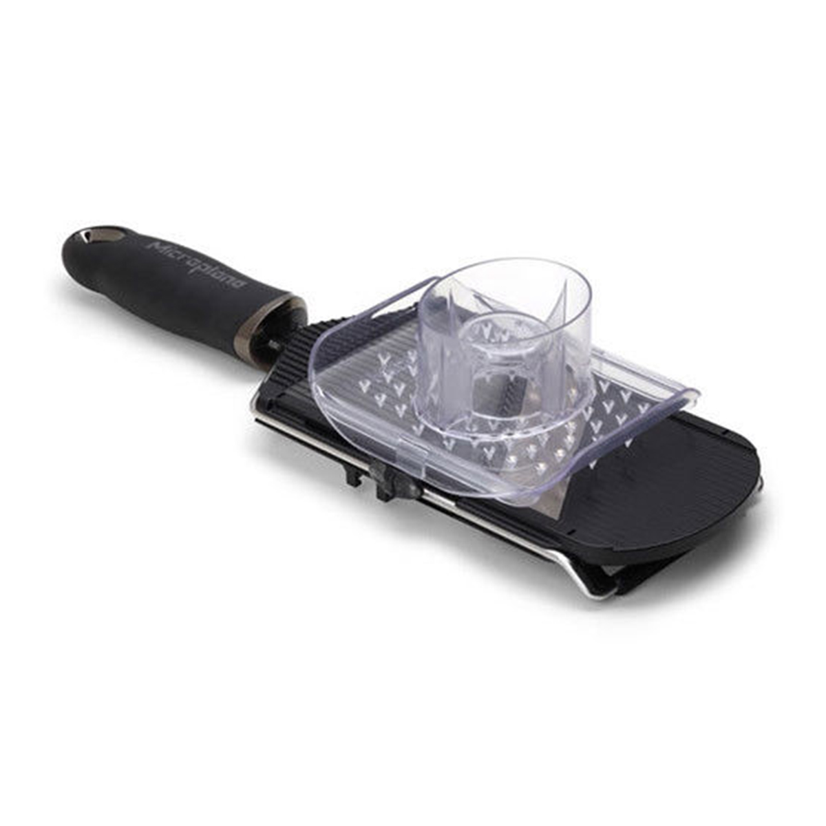 The Microplane Adjustable slicer with additional Julienne blade features an impressive ultra-sharp straight edge blade with three adjustable settings, which effortlessly slices vegetables for home-made chips, burger garnish like tomatoes and onions. The blade is reversible with an etched Julienne blade on the other side producing perfectly cut julienne strips for coleslaw or stir-fry dinners, hashbrown potatoe strips or cucumber stips for summer salads. The ergonomic soft-touch handle and the rubber foot ensure a firm hold and a flexible handling. The infinity dial allows any thickness from paper thin to ultra thick slices.
