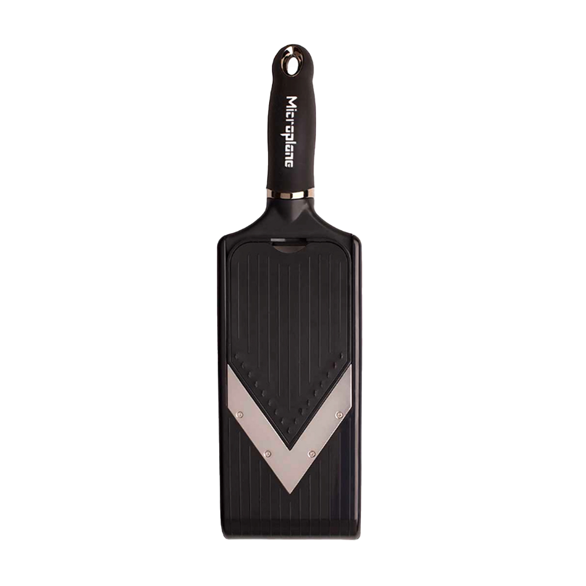The Microplane Adjustable V-blade slicer with additional Julienne blade features an impressive ultra-sharp V-blade which effortlessly slices vegetables for home-made chips, burger garnish like tomatoes and onions. The blade is reversible with Julienne teeth on the other side producing perfectly cut julienne strips for coleslaw or stir-fry dinners, hashbrown potatoe strips or cucumber stips for summer salads. The ergonomic soft-touch handle and the rubber foot ensure a firm hold and a flexible handling. The infinity dial allows any thickness from paper thin to ultra thick slices.