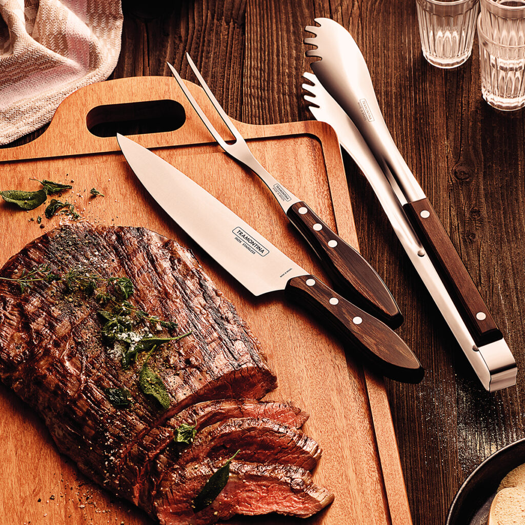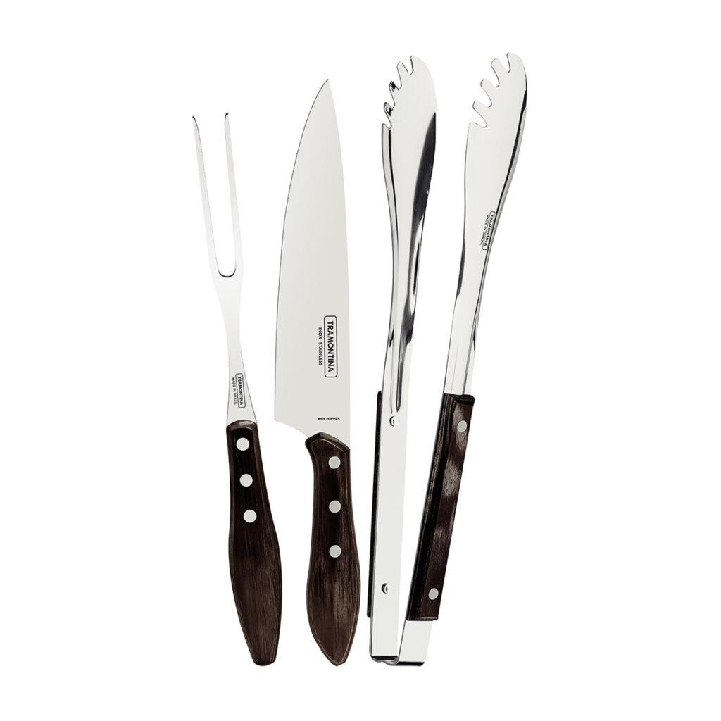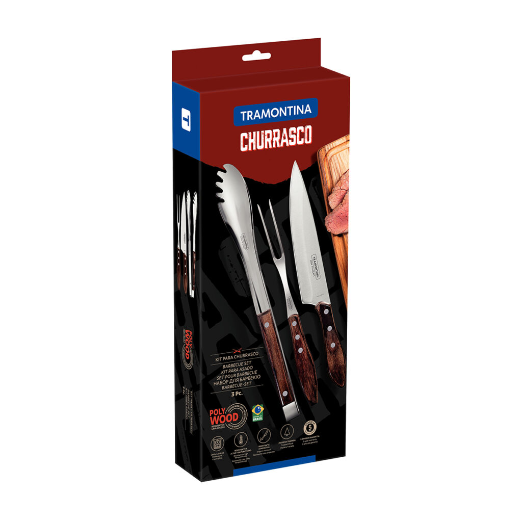 The Tramontina barbecue set with stainless steel blade, brown Polywood handles offers a complete solution for you to prepare and serve a delicious barbecue. With the Tramontina barbecue set with stainless steel blades and brown Polywood treated wooden handles, 3 pieces, you will have the possibility of having an excellent cut of meat, in addition to making the moment of serving everyone more practical. The pieces are produced with durable stainless steel blades. The Polywood treated wooden handles are resistant to impacts and high temperatures.