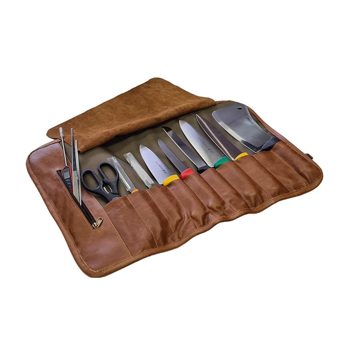 - Mini pocket with metal zip for those mini must-haves such as a thermometer, scissors, garnish tongs, peeler, paring knife, protective gloves, etc.