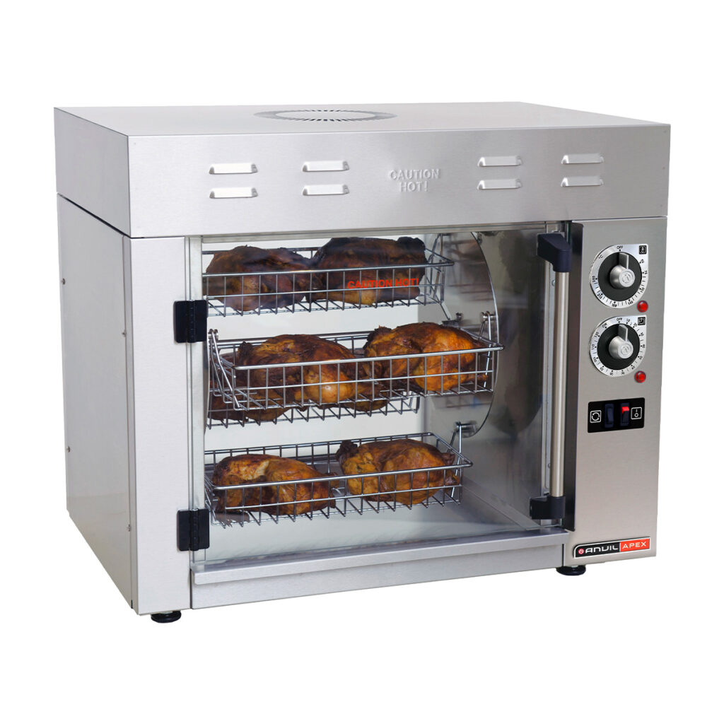 Anvil’s compact, yet extremely efficient Chicken Rotisserie Griller comes in a 8 bird and a more commercial, 16 bird size. Operating at a temperature range of 50-250 Degree Celsius, the fan creates hot air circulation ensuring even heat distribution. The Anvil rotisserie griller produces delicious and juicy chicken while the removable drip tray can be used for side dishes such as hot chips or roasted vegetables. Ideal for small supermarkets, restaurants, takeaways, or your very own kitchen.