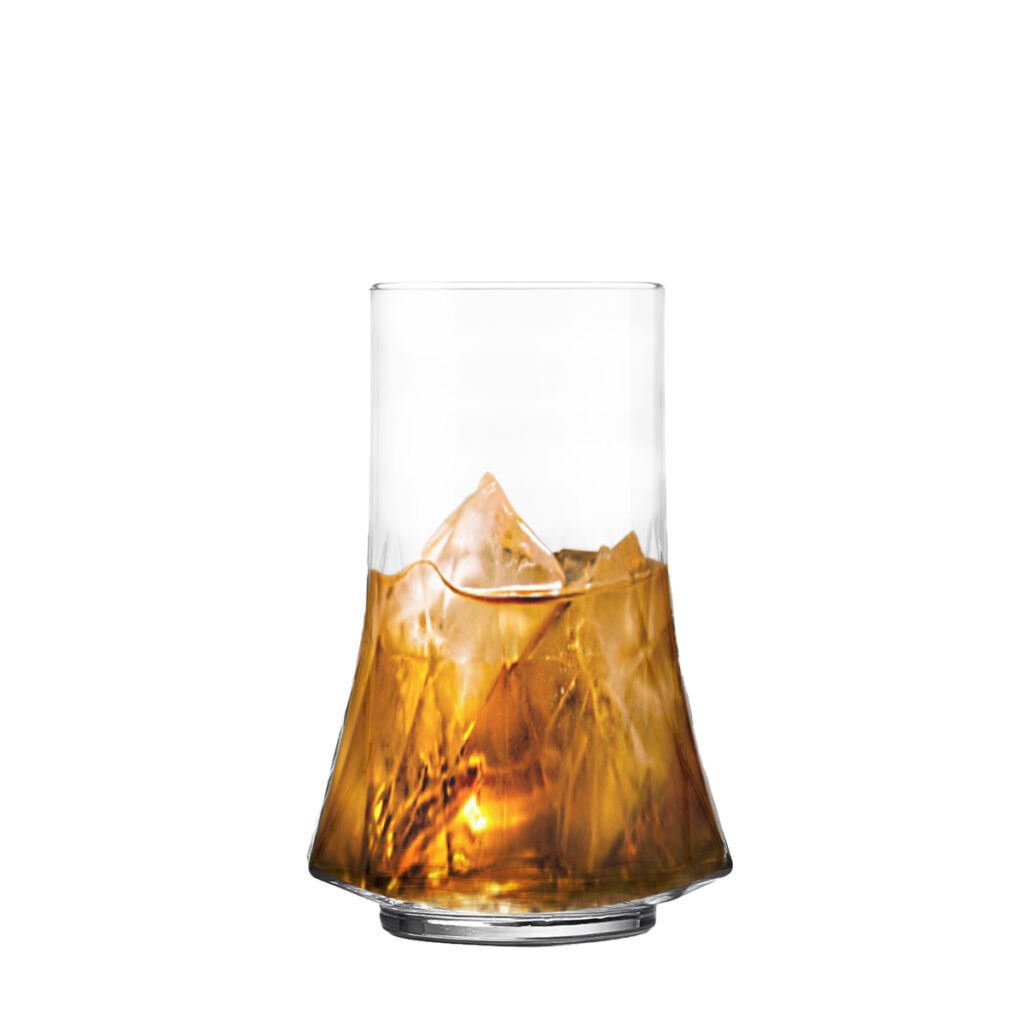 The Divergence rock glass has a wide base with tapered sides and a decorative cut look. It is very appealing with a charming Art-Deco feel.