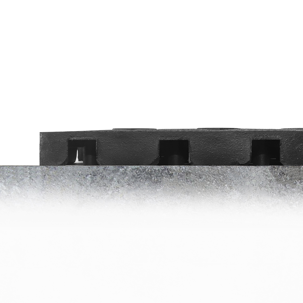 Premium mid-size interlocking anti-fatigue tile. This extra thick tile provides comfort and fatigue relief for standing workers. Precision designed tiles seamlessly clip together for smooth raised floor surface. Convenient tile size allows for easy planning. Can be used to cover large or unusually shaped workstations. Made from rubber for durability, slip, and impact resistance.