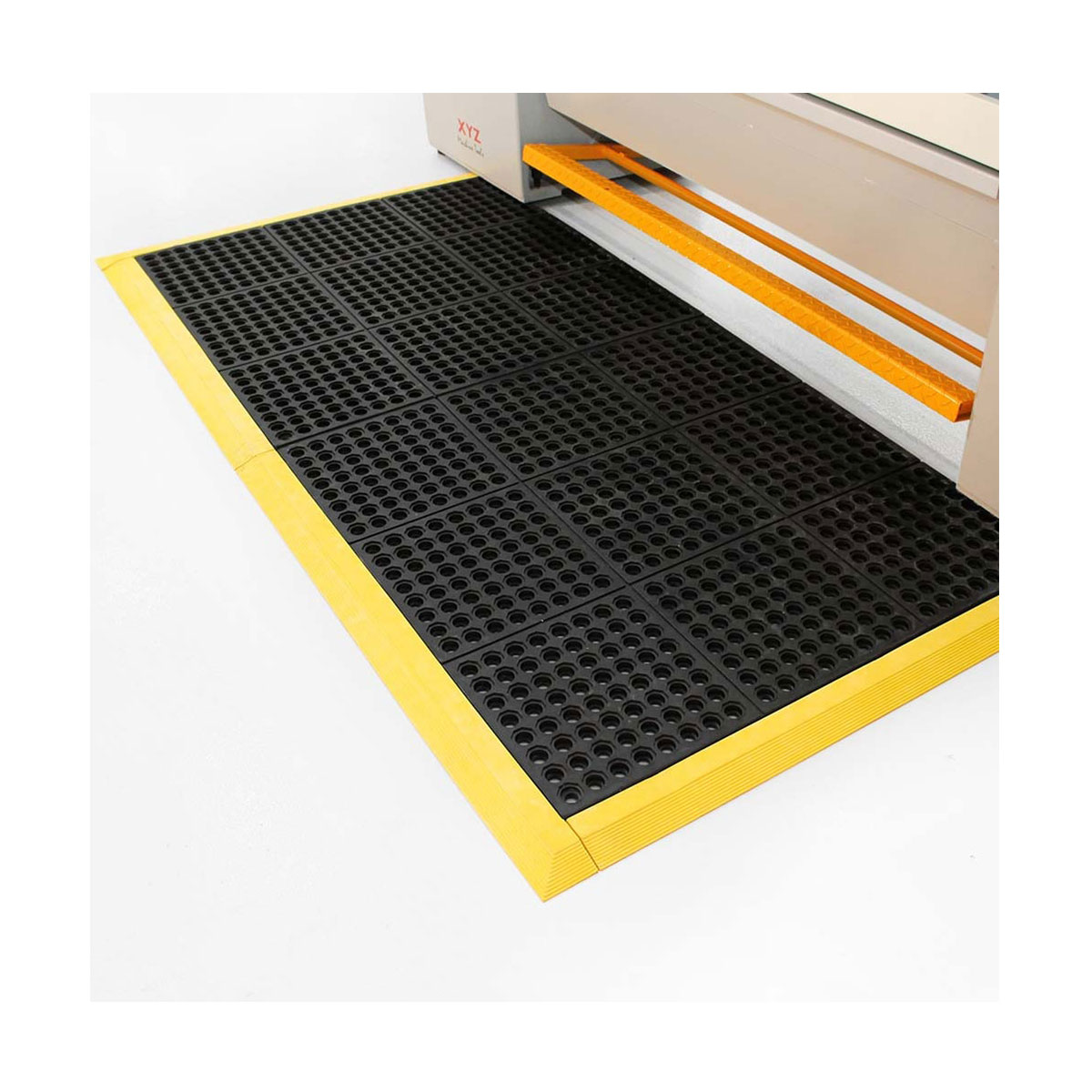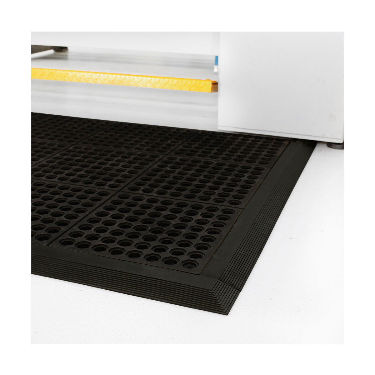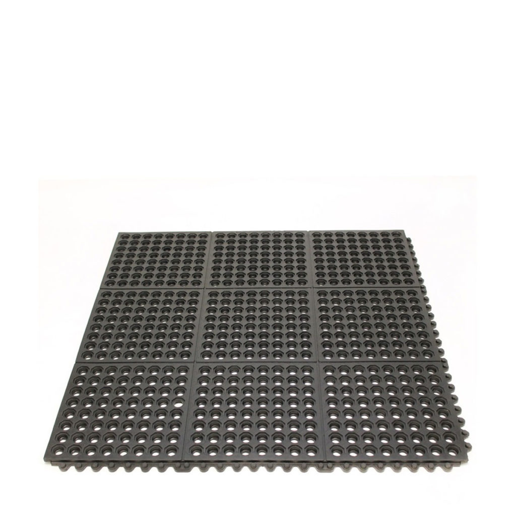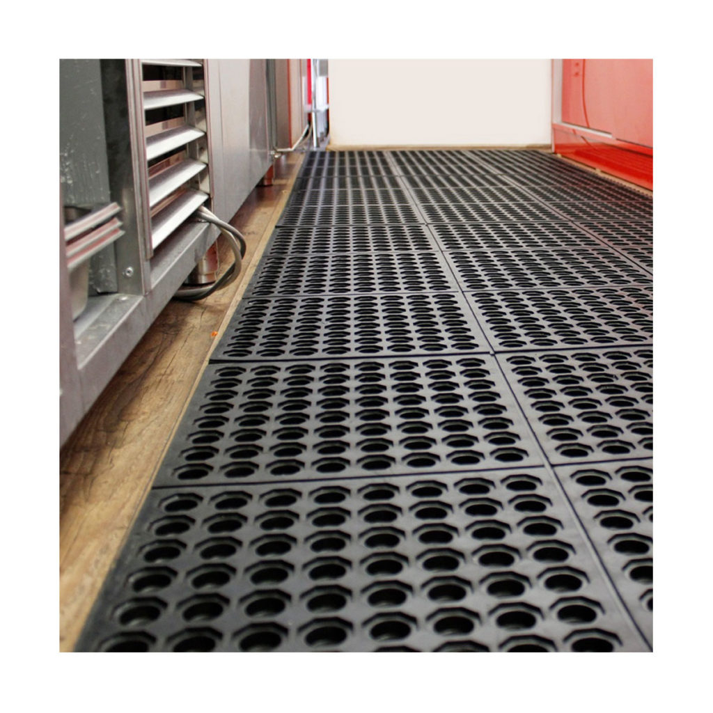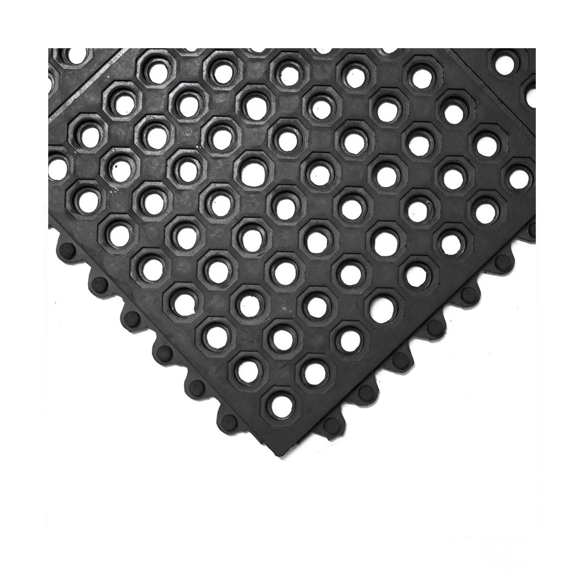 Versatile interlocking rubber floor tiles. Ideal interlocking rubber tiles for bars and kitchens. Open holes allow drainage of spilt liquids. Reduces the risk of slipping on wet/greasy surfaces. Effective anti-fatigue properties. Easy to install, move, clean and replace.