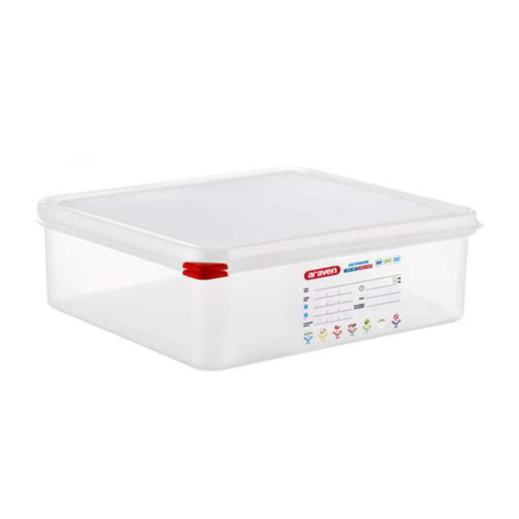 Keep food fresh for longer with excellent storage equipment like the GN 2/3 airtight container by Araven. These containers are made from high-impact resistant polypropylene that’s suitable for food contact and come complete with airtight lids for ultimate storage capability.