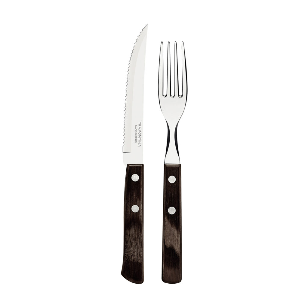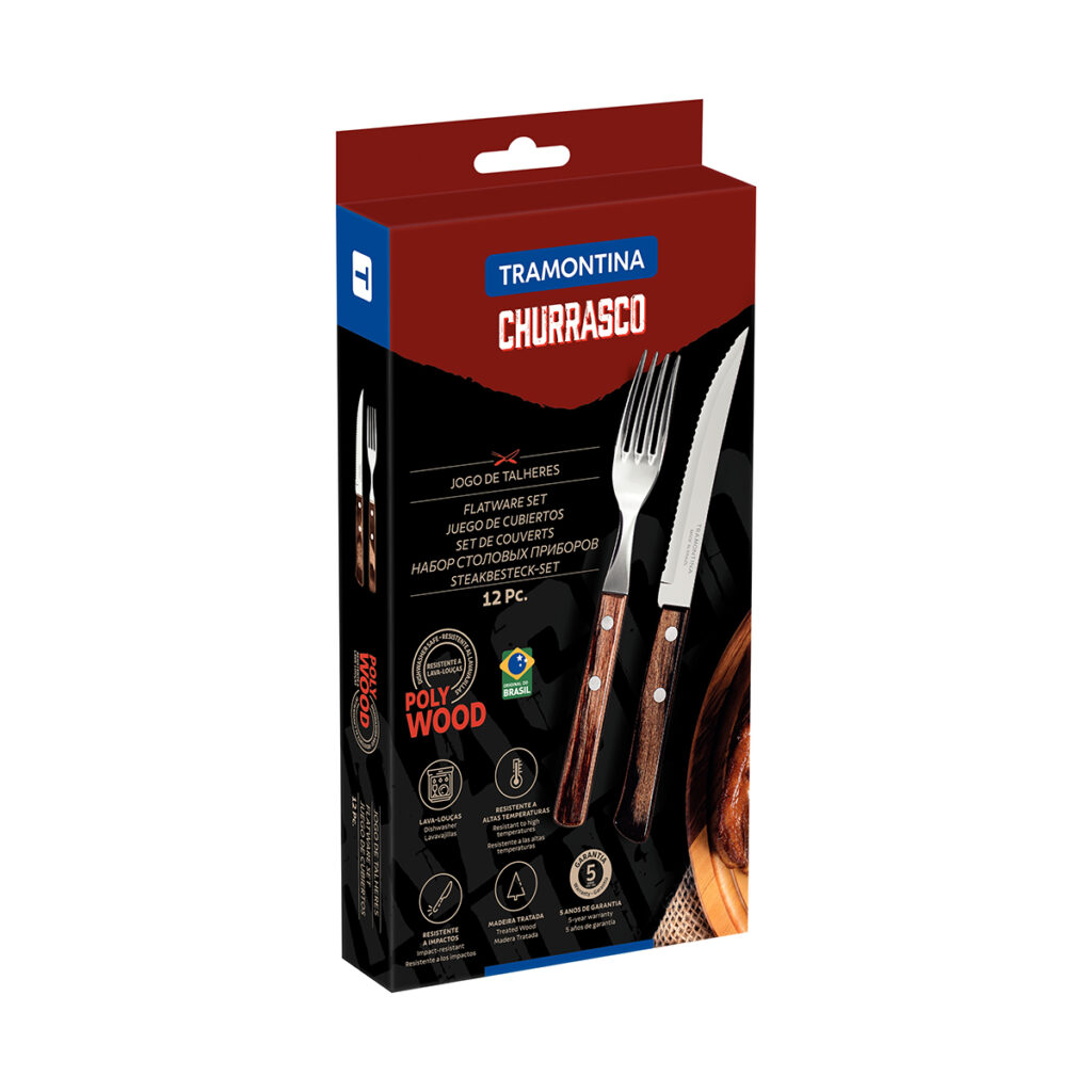 The Tramontina 12-piece stainless steel barbecue flatware set with brown Polywood handles is a must-have on your table. It’s the best option for those looking for quality pieces with a unique design, offering the perfect experience for enjoying a real barbecue. The barbecue line set features forks and knives made with durable stainless steel blades and beautiful polywood-treated wood handles, which provide resistance to impacts and high temperatures.