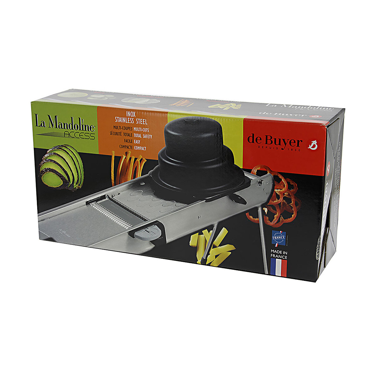 Slice with perfection using the convenient, adjustable stainless steel Access Mandoline slicer by De Buyer. This phenomenal kitchen utensil comes complete with several blade options for complete control over slice thickness and shape.