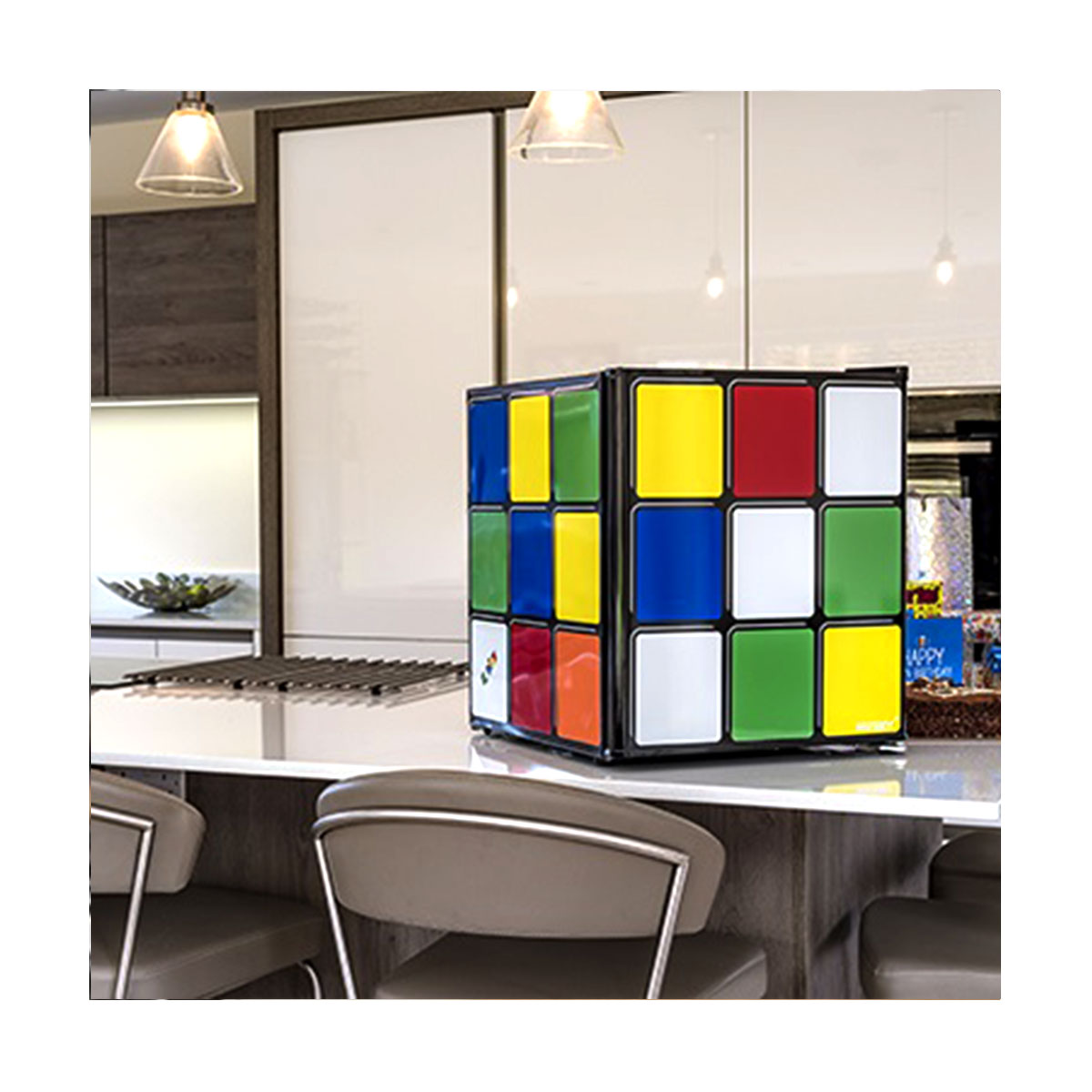 Store and serve ice cold beverages or fresh and perishable food in style this summer with this fun Rubik’s Cube counter-top chiller.