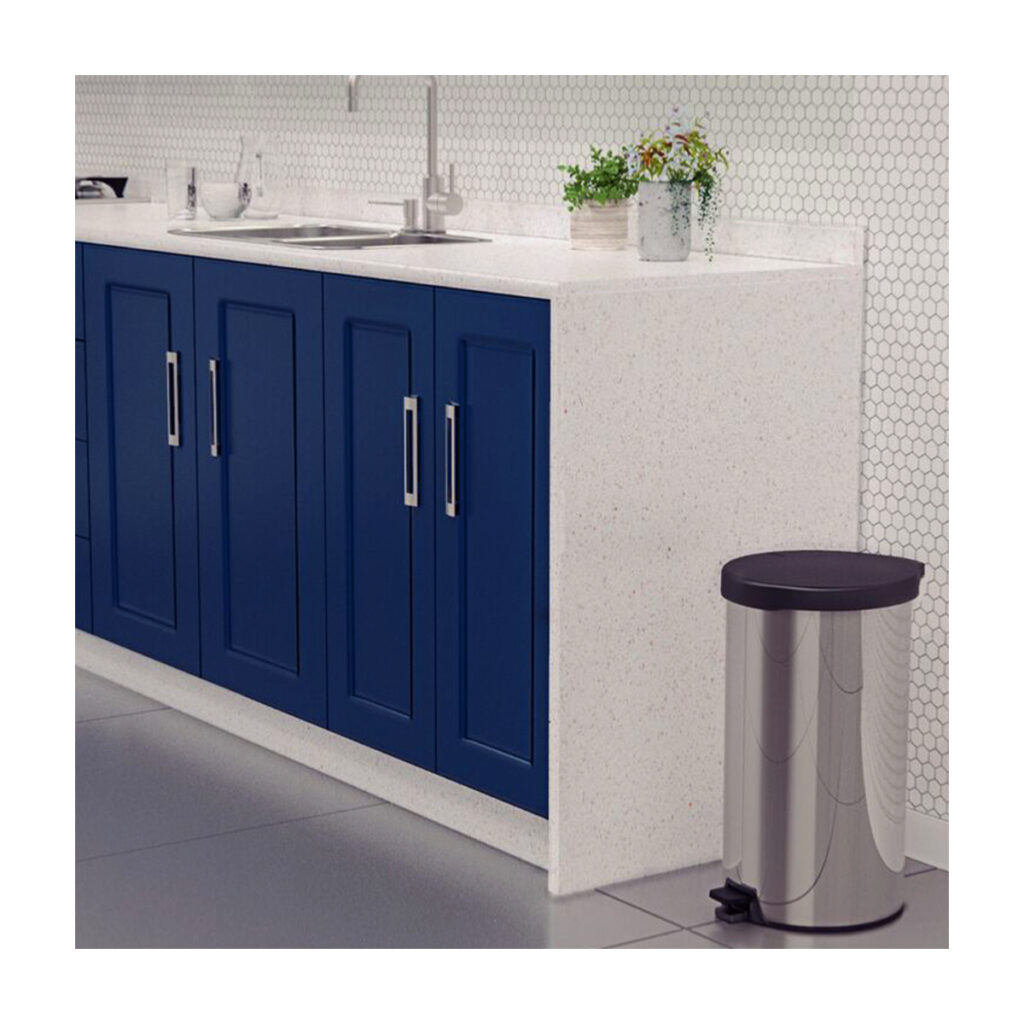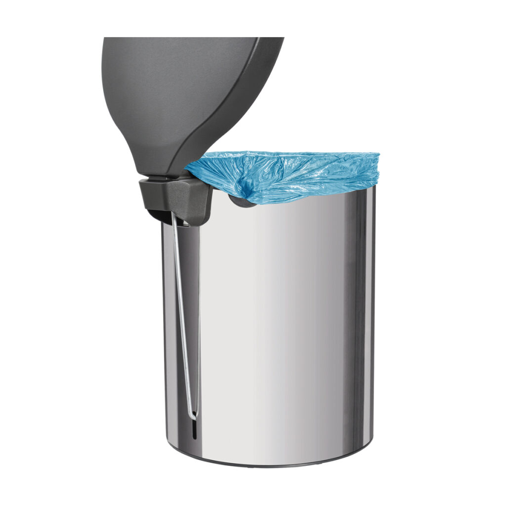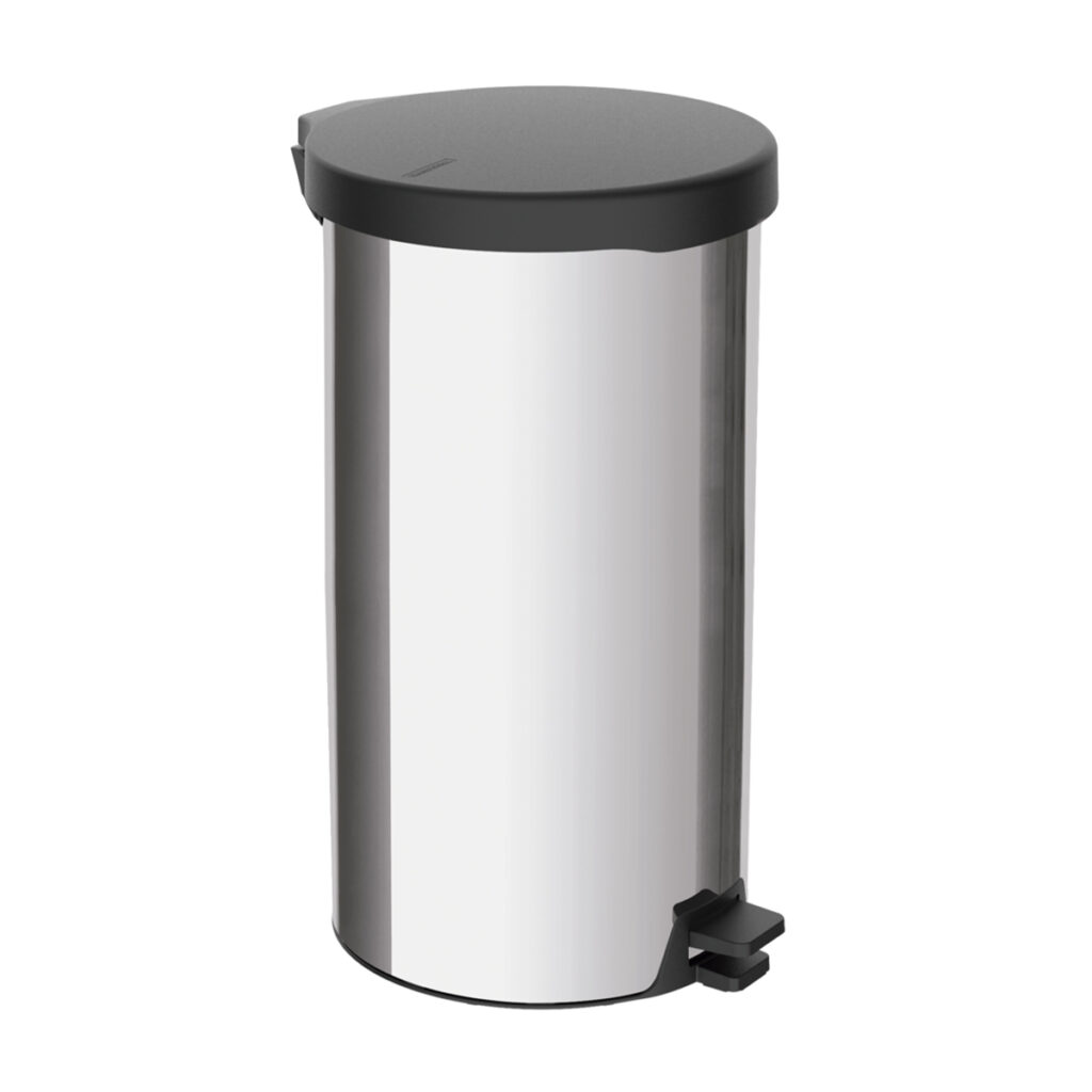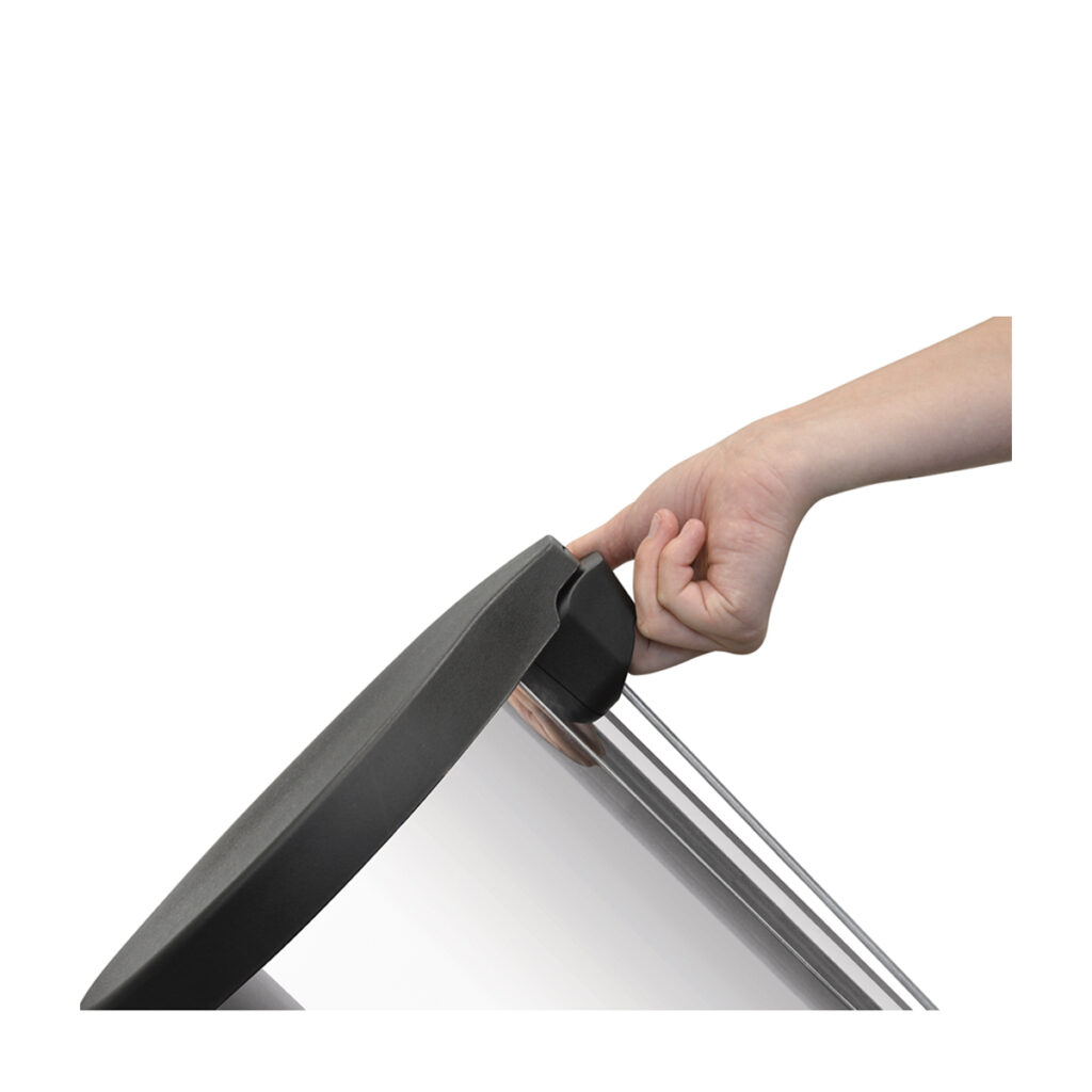 The New pedal bin range with plastic lid by Tramontina can be used for a variety of areas to offer a hygienic, convenient and durability solution for waste management. This bin with it’s compact shape, stylishly polished stainless steel body and black polypropylene lid, pedal and base is designed to withstand over 1 million cycles of opening and closing the lid and has a handle for easy transportation, which makes it great for managing domestic or semi-commercial waste. The 20L capacity offers ample space for a domestic kitchen or restaurant restrooms and can be used with 30 – 40L bags as well. The clever lid design will not hit the wall when opening, and with a closed and smooth interior, the trash bag can be put directly into the bin, and attached to the side hole for effortless use.