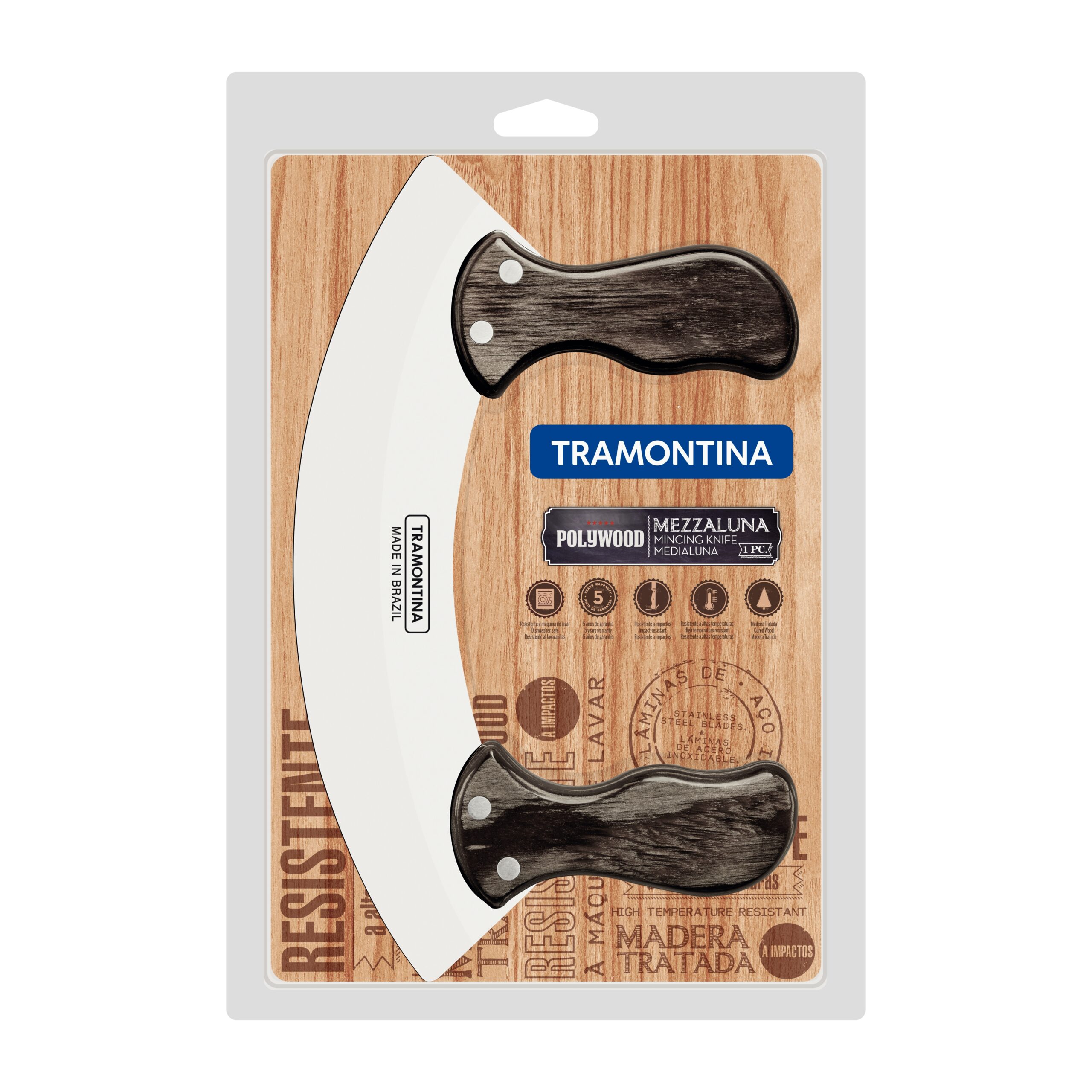 With the Tramontina Polywood mezzaluna with stainless steel blade and brown treated wood handle, you can quickly and precisely cut your seasonings. Its curved blade allows you to easily cut herbs and seasonings, such as parsley, rosemary and chives. Made with a stainless steel blade, it is highly resistant and has an excellent quality edge. It has two treated Polywood handles that make handling more comfortable and safe, in addition to being highly durable. The handle is resistant to impacts and high temperatures.