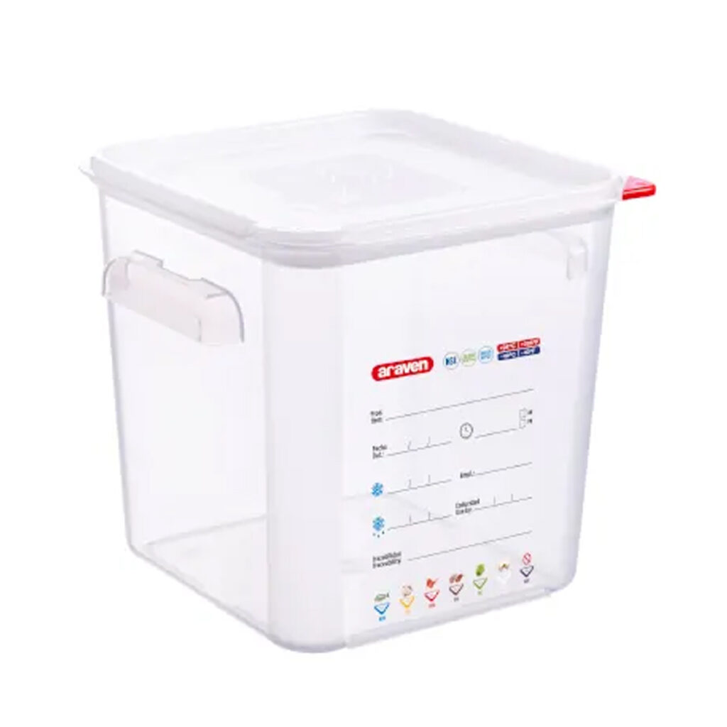 This square shape optimises storage space and means that no space goes unfilled. Side handles on the outside to facilitate handling and transport. Airtight lid to fully protect the food. The lid is made using LDPE, a highly flexible material that easily adapts to the shape of the base. Colour coded to avoid cross-contamination. Araven Containers, thanks to their Color-Clip identification, help prevent Cross Contamination, ensuring that the contents of this container will always be of the same nature: poultry, red meat, vegetables/fruits or fish.