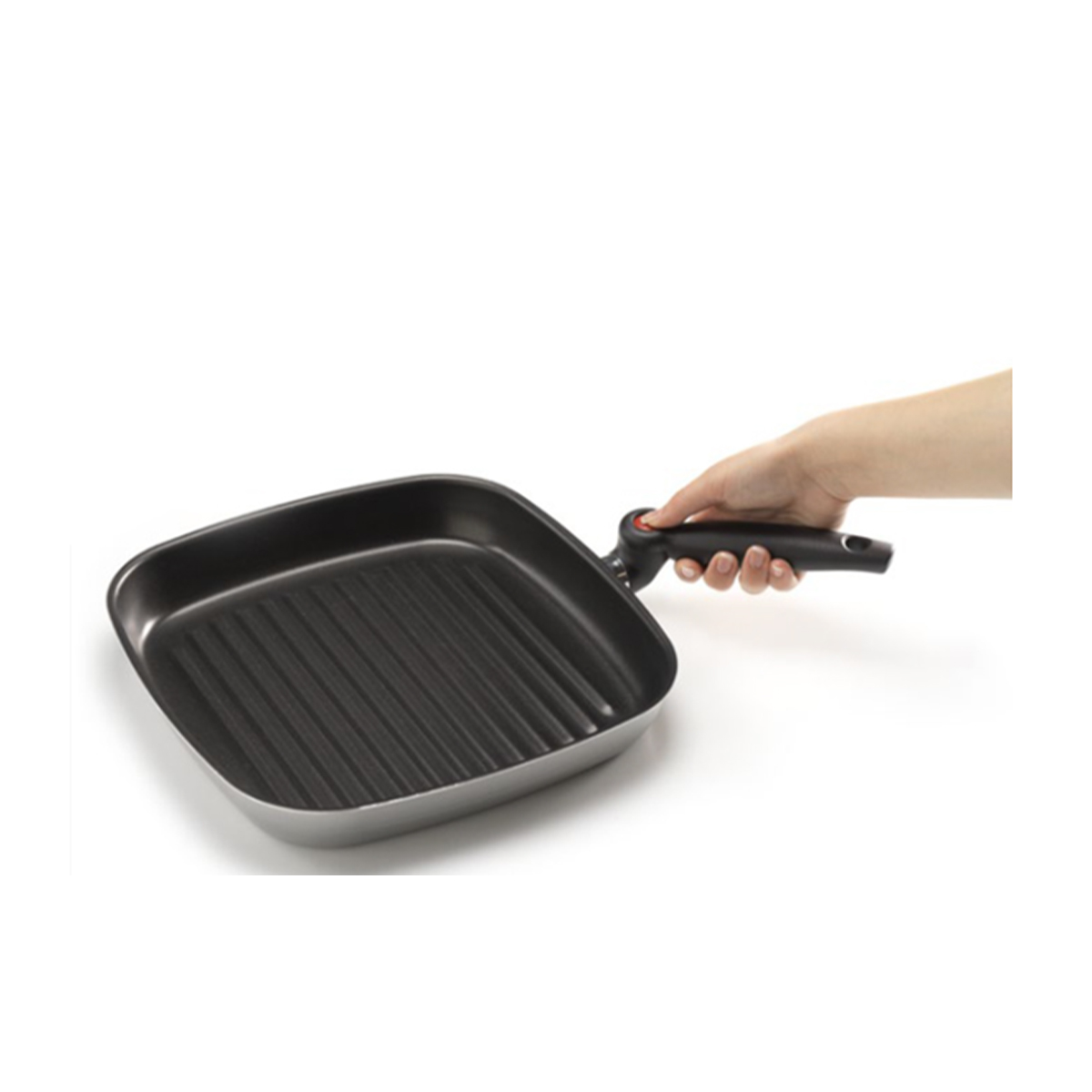 Aluminum body, no PFOA, practical, long duration, value for money, ideal for a good cooking of any food. Light and functional, thanks to its groves it allows a cooking without fat contributing to the realization of healthy dishes, functional with its folding black Bakelite handles. It is made in Italy in all its parts.