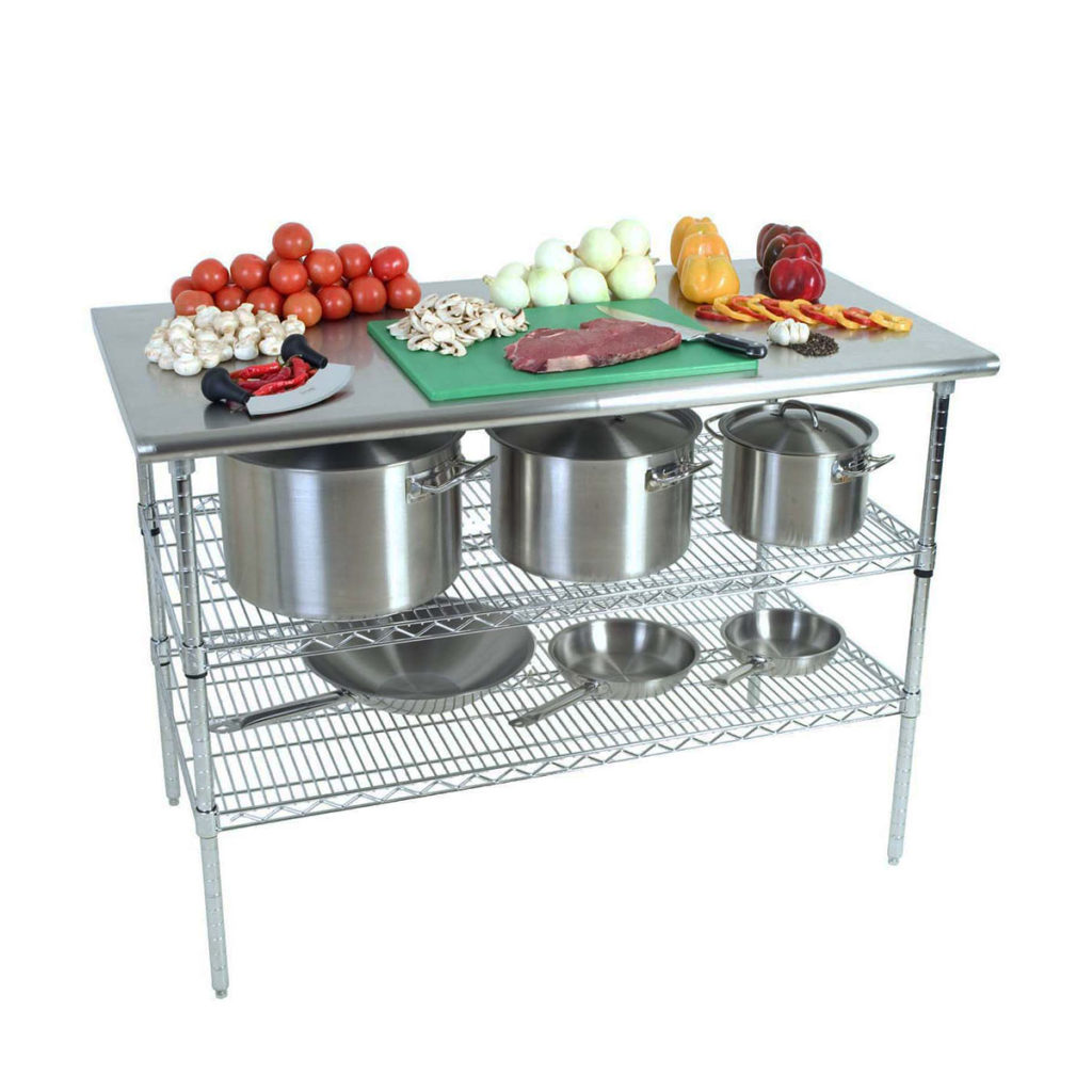 Easy to assemble, table top stainless steel, shelf heights can be adjusted. Grid style shelves allow air circulation. Dismantle for easy transportation