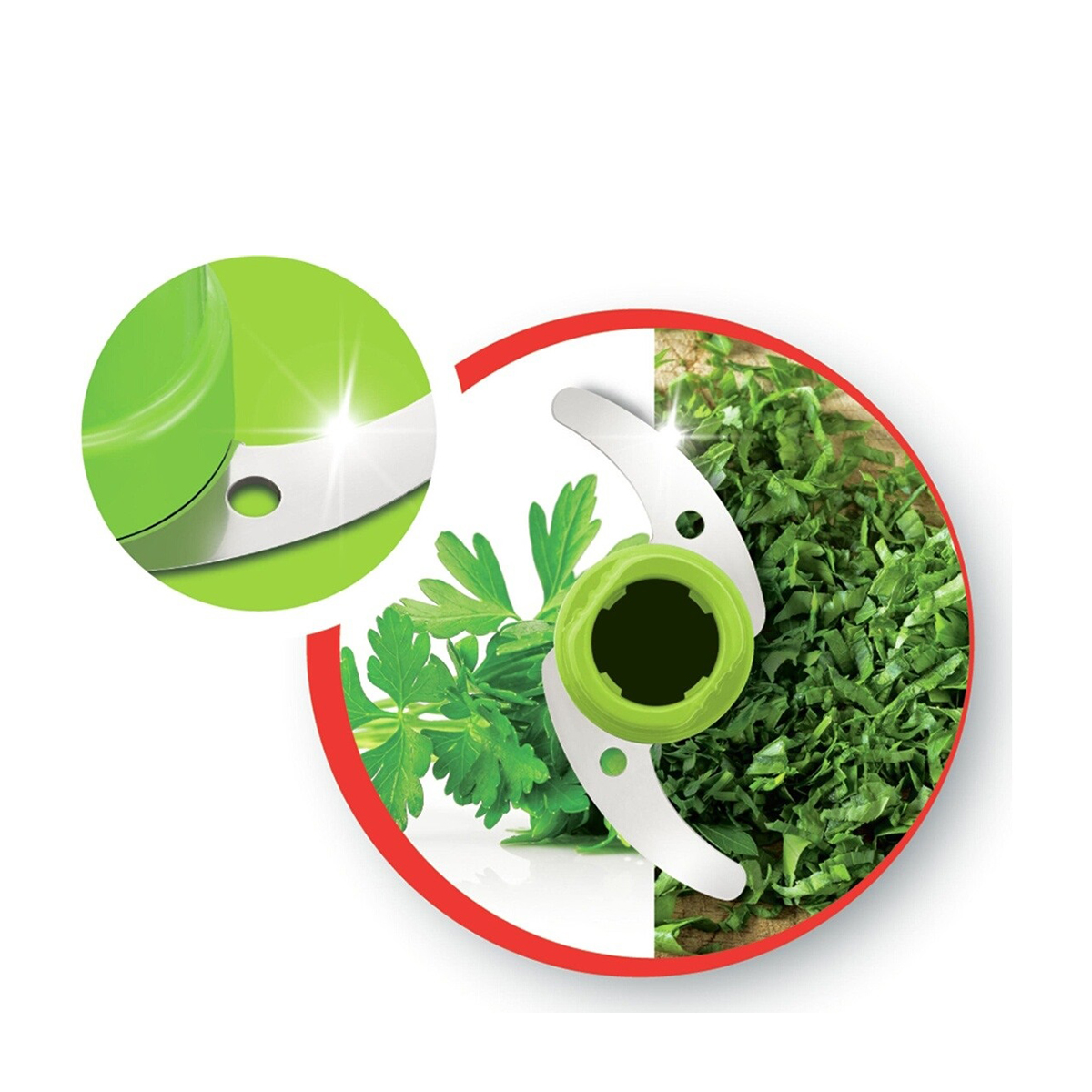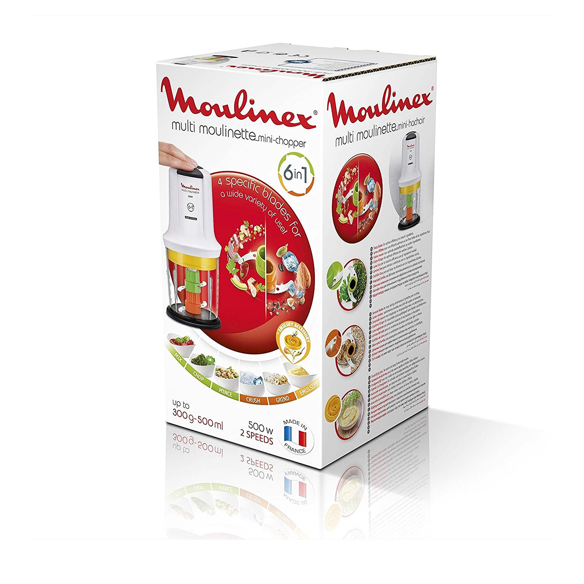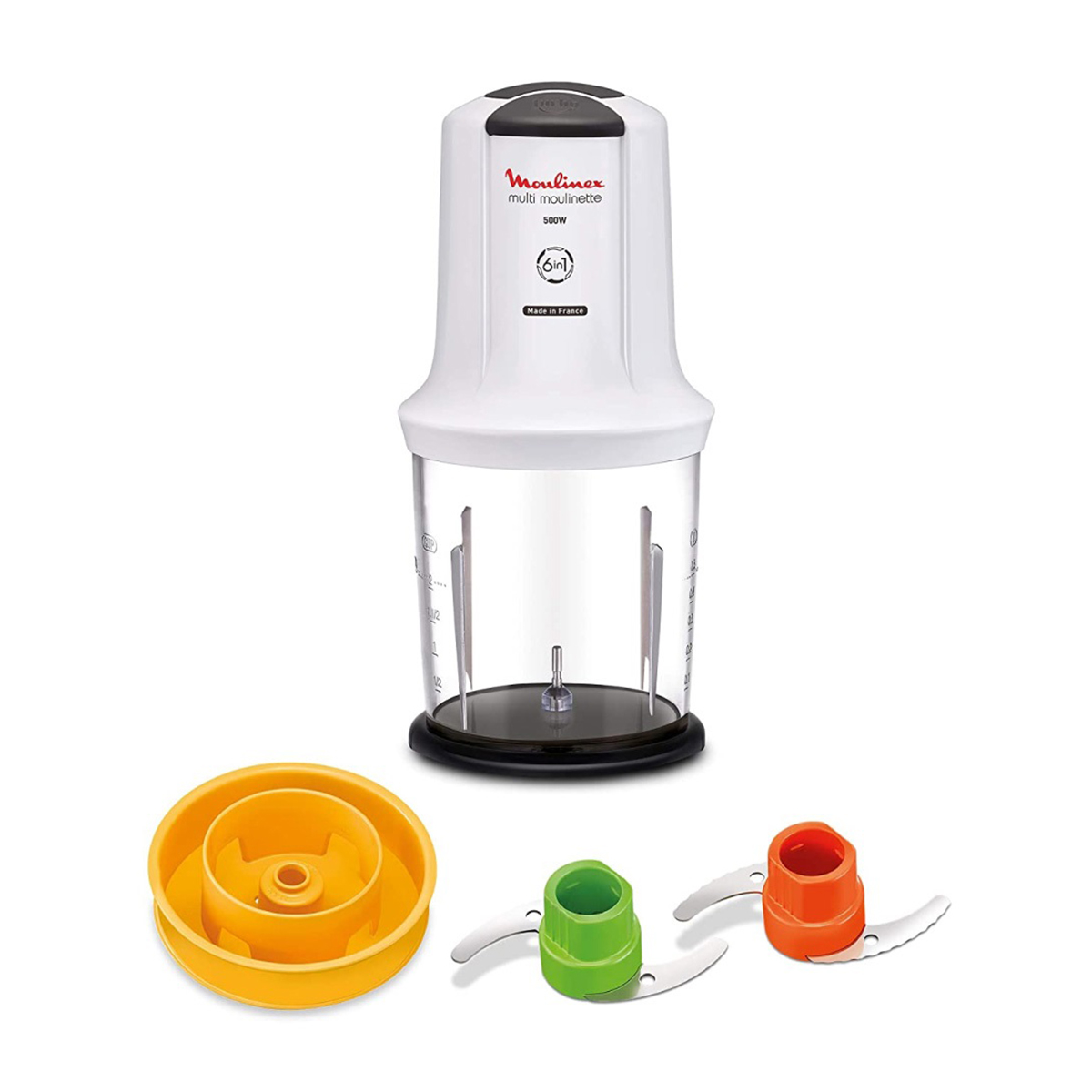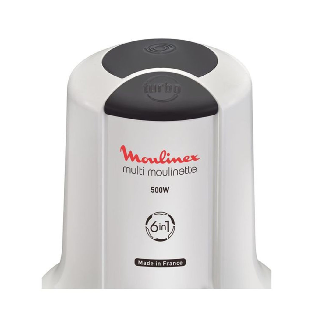 The Moulinex Xtra Chop 6-in-1 chopper with its powerful 500W motor and specialized blades is the perfect preparation tool for any kitchen. Designed to effortlessly chop, mix, mince, grind, crush and emulsify. The smooth, sharp blades are used to easily chop herbs, garlic, meat and onions, while the serrated blades are used to grind coffee beans or even crush ice. It also includes an emulsifying disk to blend sauces, make mayonnaise or whip up your favourite ice cream dessert in seconds. All the parts are dishwasher safe for a quick and easy clean.